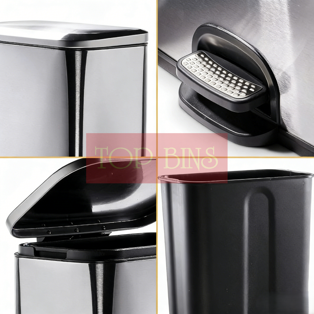 4. Durable Construction: Made with a SUS201 Stainless Steel outer bin for a sleek, rust-resistant finish, paired with a lightweight, removable PP (Polypropylene) inner bin for easy disposal and cleaning.